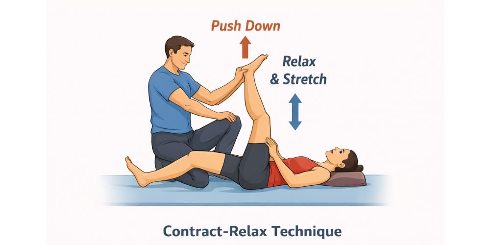 For example, during a hamstring stretch, a therapist lifts your leg while you gently push against resistance. Once you relax, the leg moves further into the stretch, improving range of motion safely.